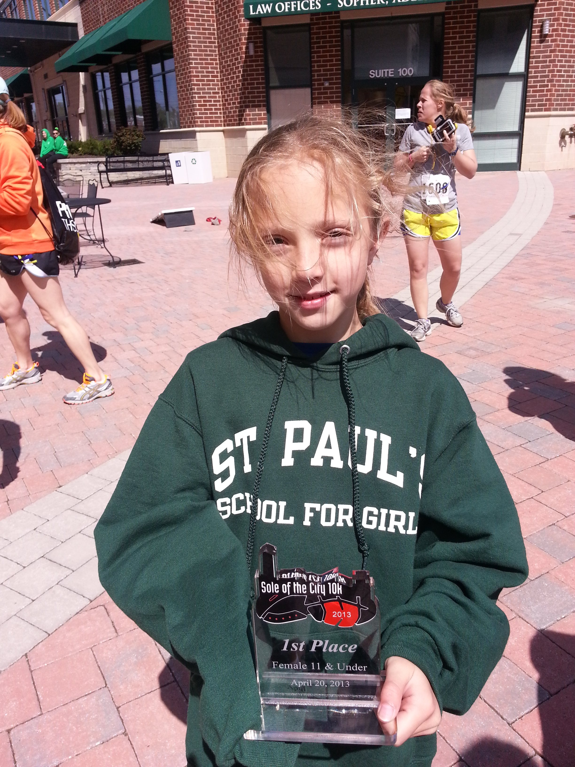 Liz ran hard the whole race. The other runners made lots of positive comments to Liz on the course, about her shirt and how awesome of a runner she was. Coming to the finish line, Liz picked up her pace and finished strong. She finished first place in her age group with a time of 51:38. Congratulations, Liz.