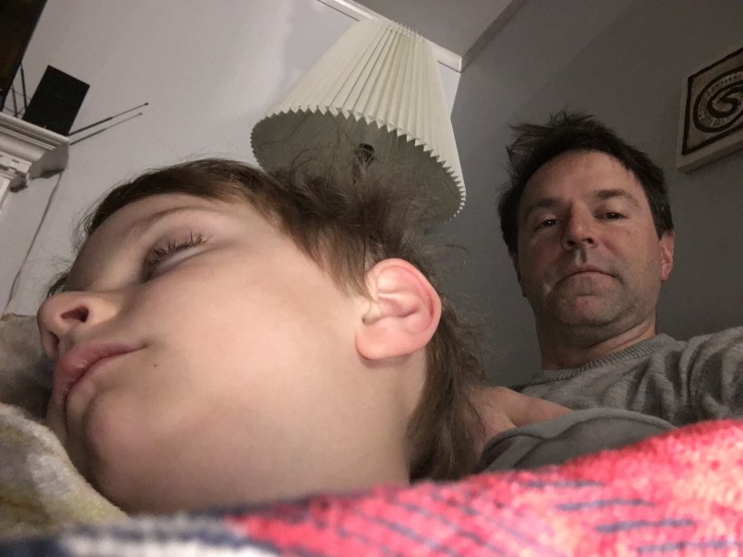 I have grown accustomed to sleeping on the couch since my dad got out of rehab. Marcia or me or both sleep on the couches on the first floor so we are able to get up in the middle of the night when my dad wakes and needs to go to the bathroom. Last night, Luke, Maggie and Jack all fell asleep on the couches with me.