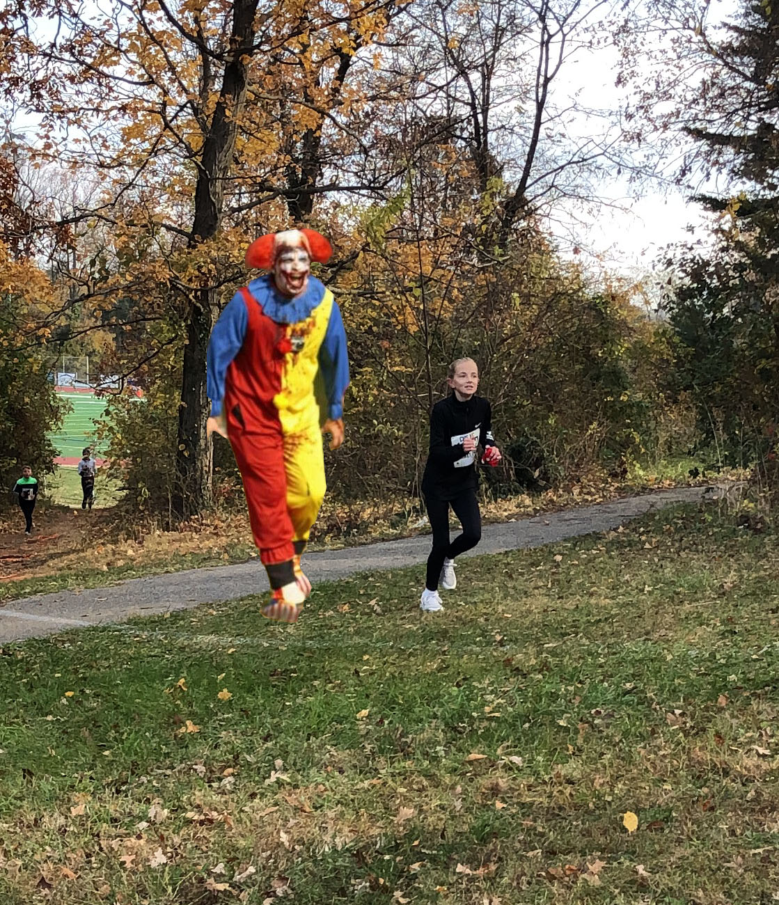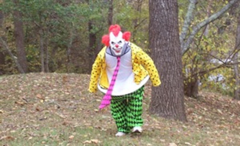 A clown was right next to us. We did not see where he came from, but Jack thinks he came from the woods. He was hideously laughing and breathing heavy and telling us he was going to take that tree back to the woods.