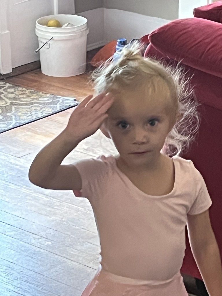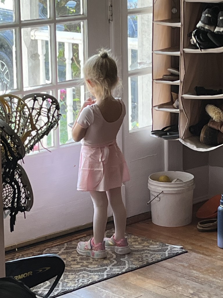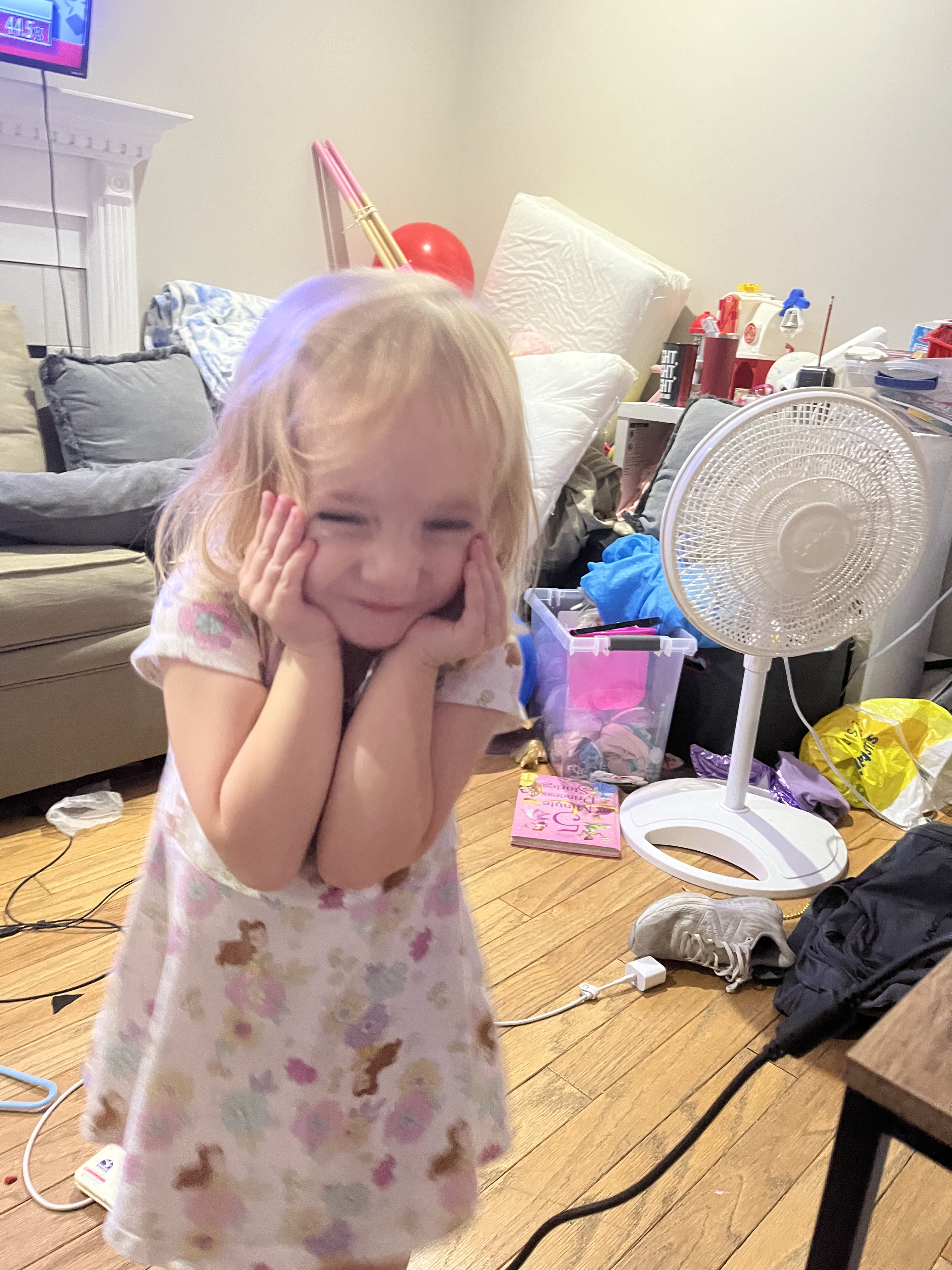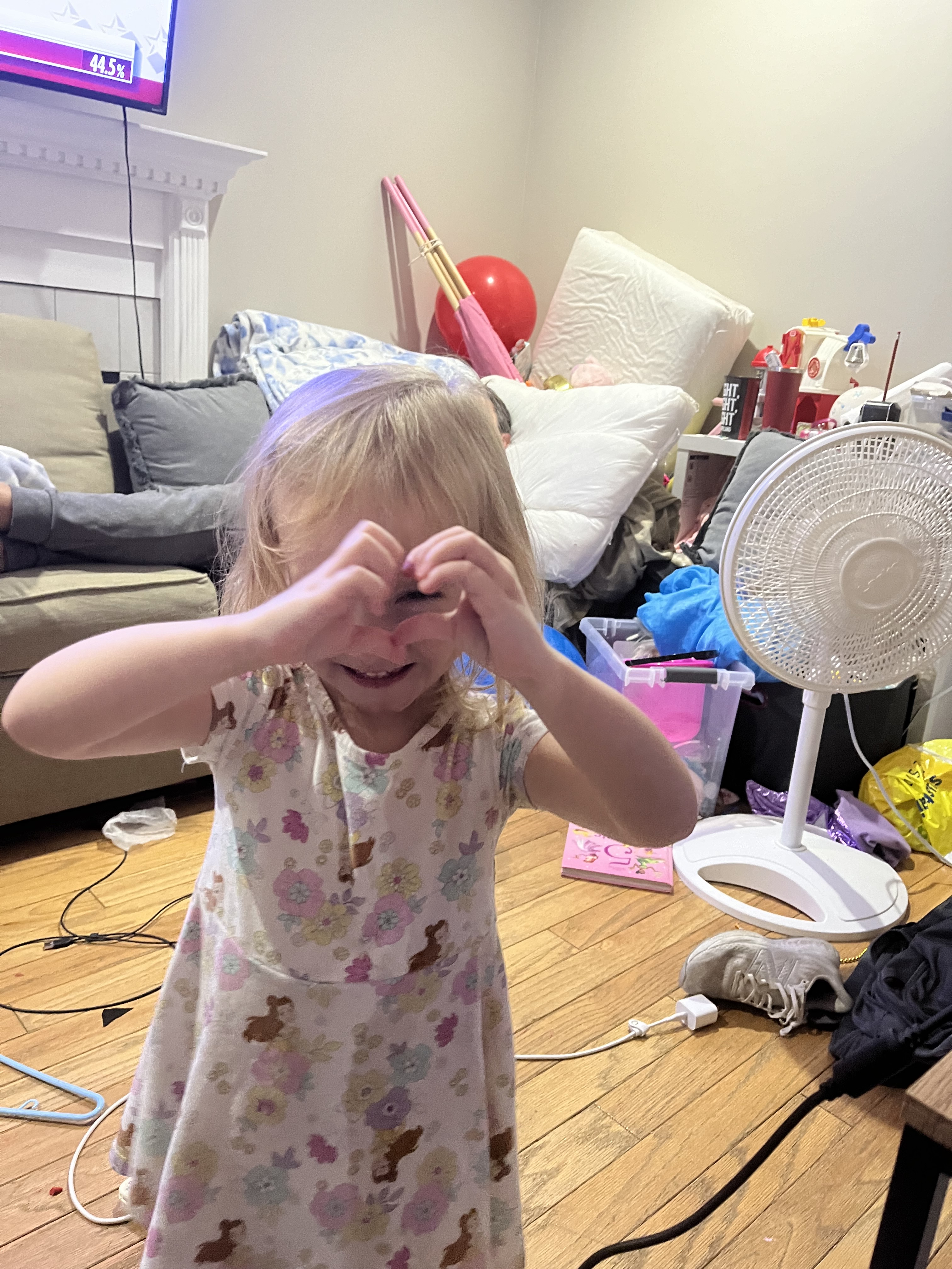 Eden and Lila dancing in the living room on New Year’s Eve. Liz is riding a tricycle.