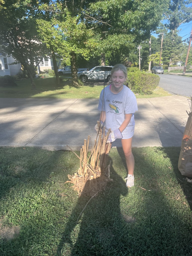 Maggie, Eden and Luke all helped remove what was a huge eyesore in the front yard. A big bush and wrapped all around it an equally thorny stickerbush. All told, we filled about 20 bags of yard waste.